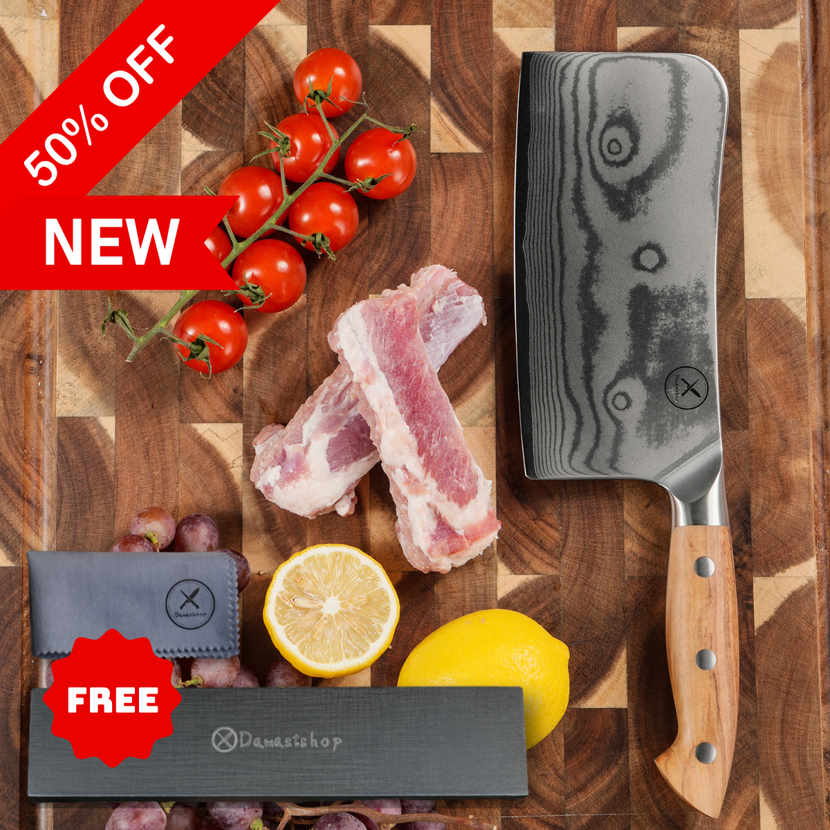 Premium Damascus 7 inch. Bone Chopper Olive Wood